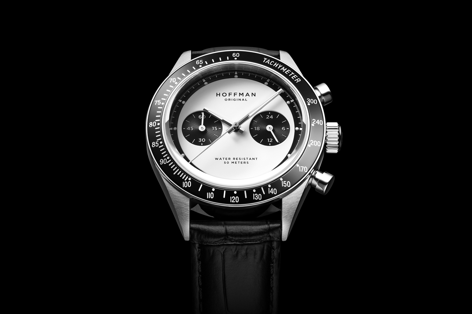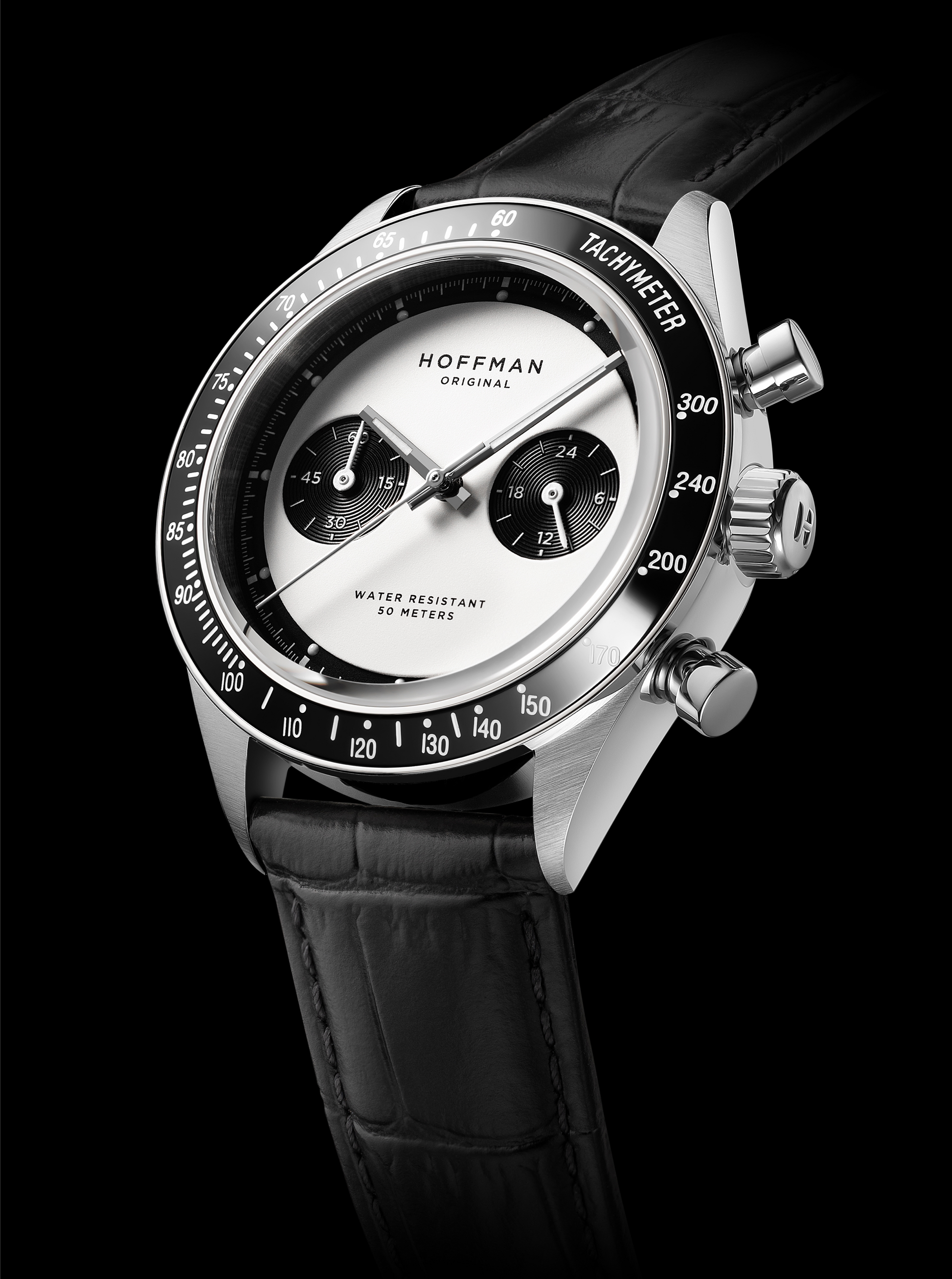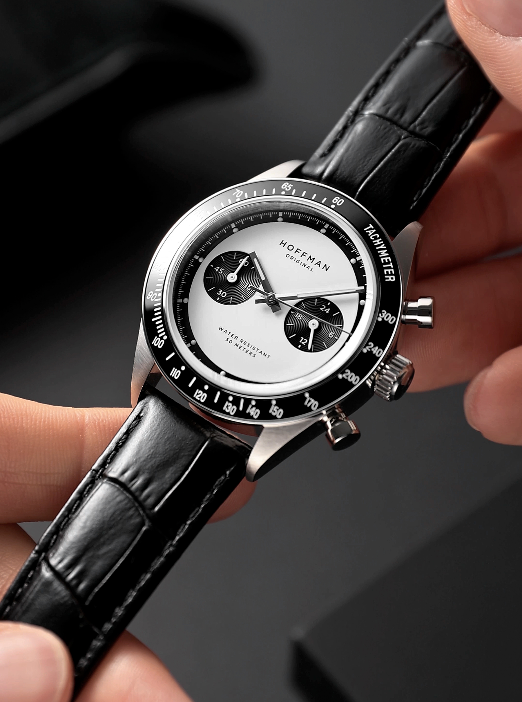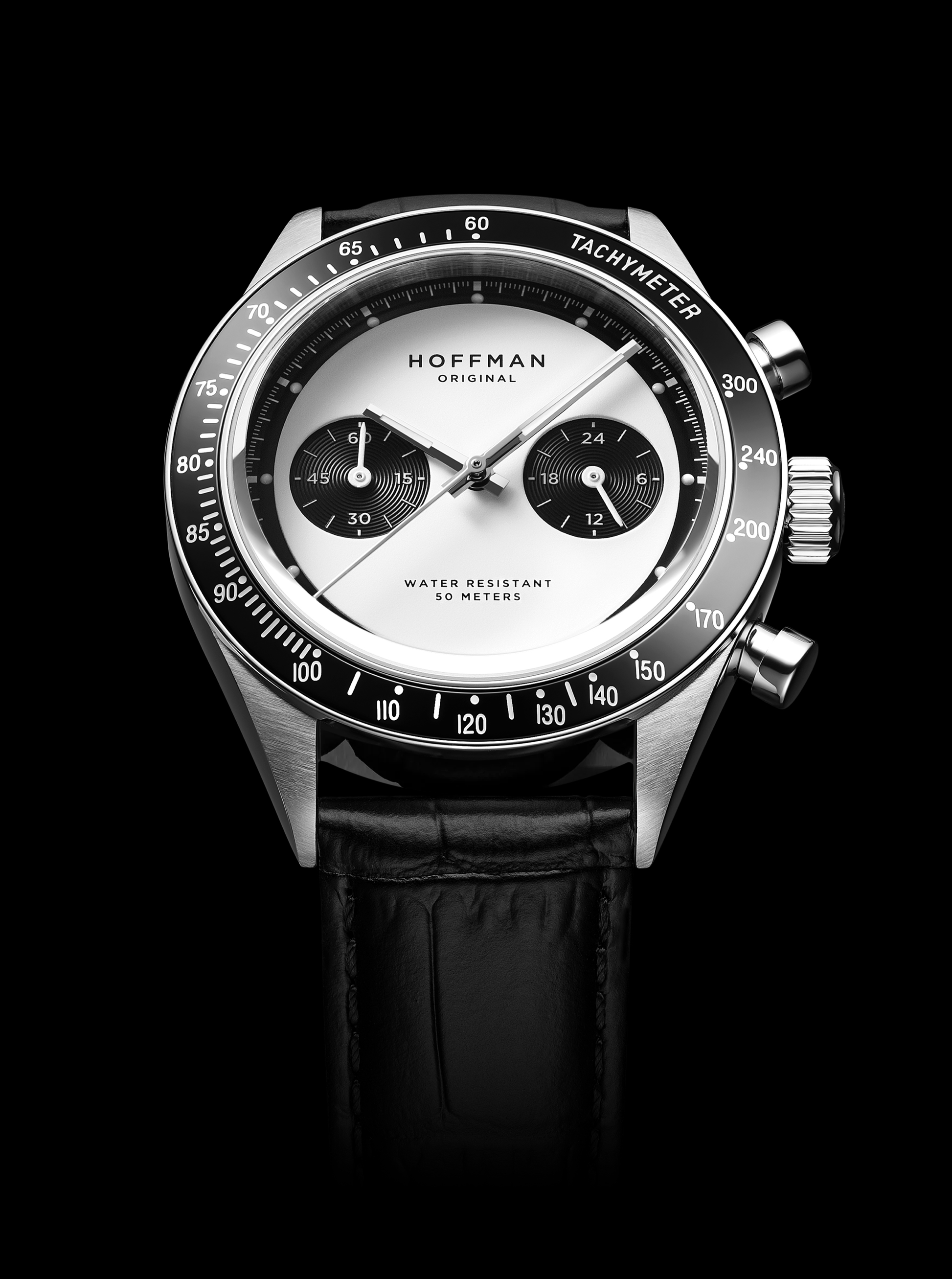 Polished black IPG bezel with engraved tachymetric scale.