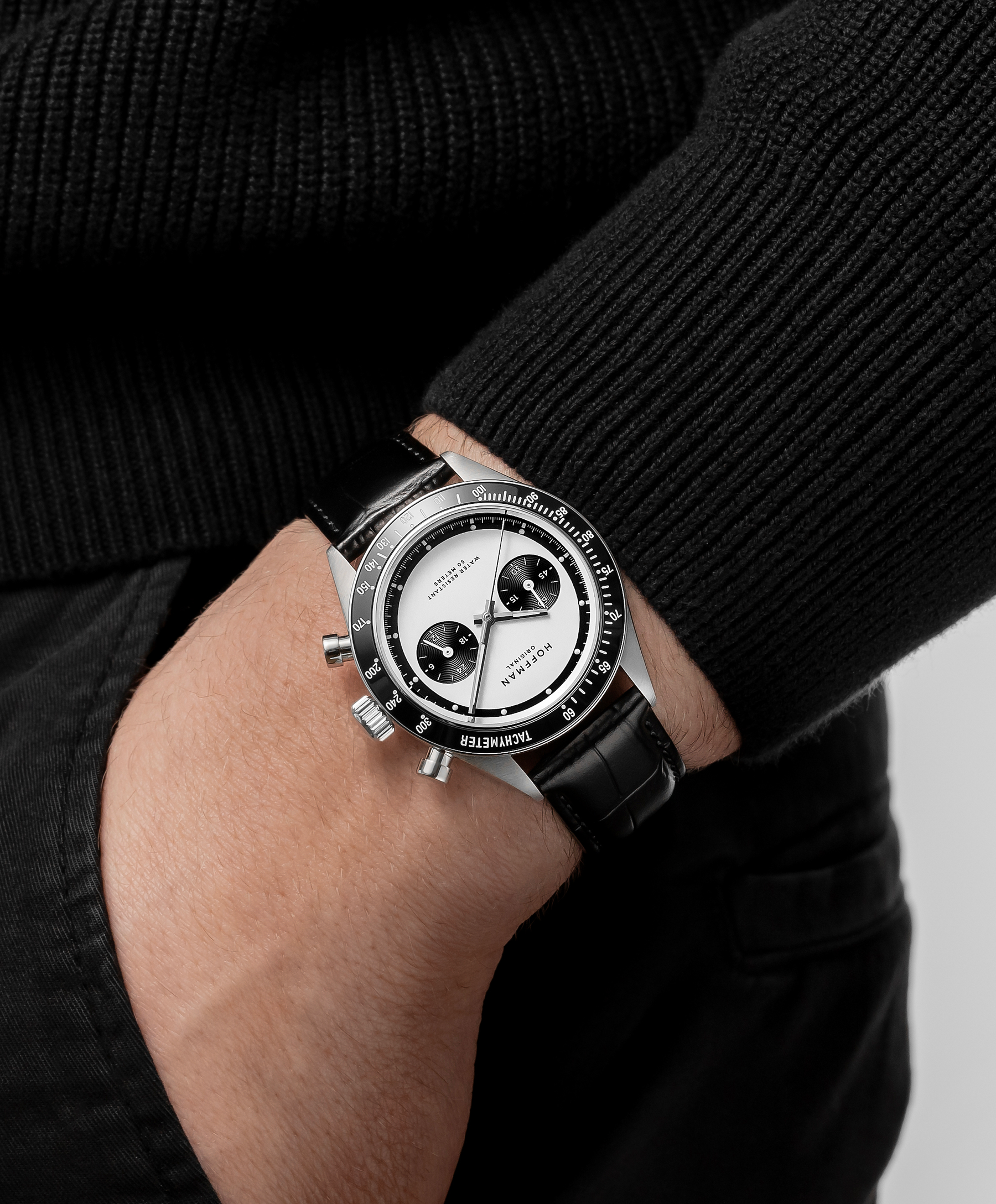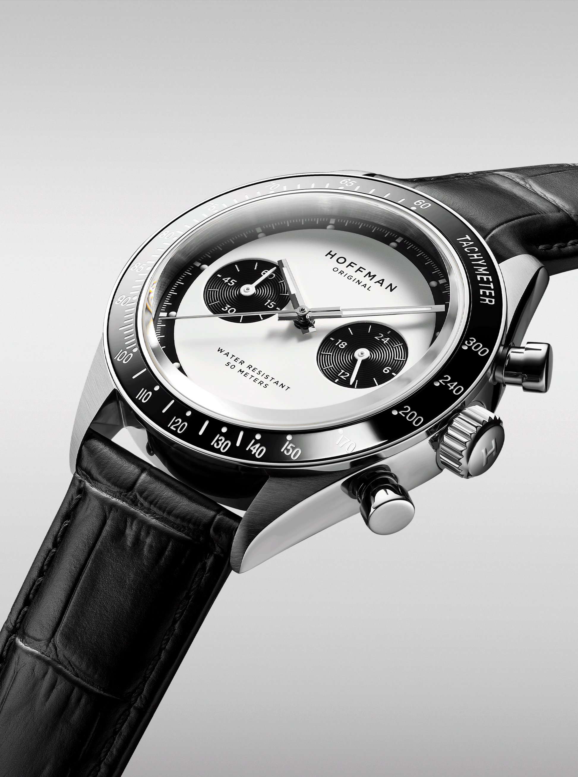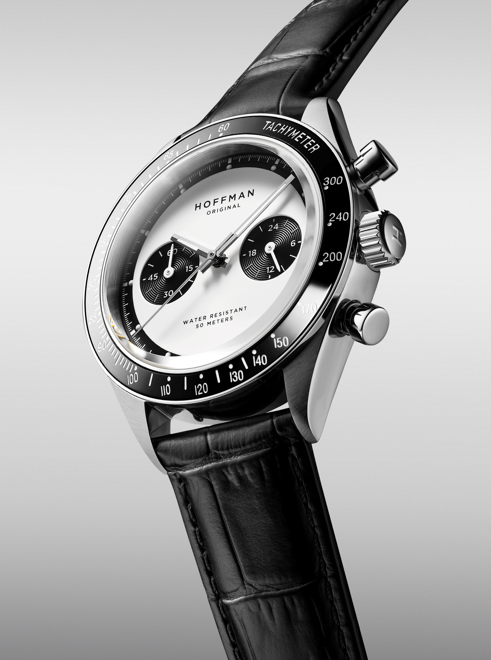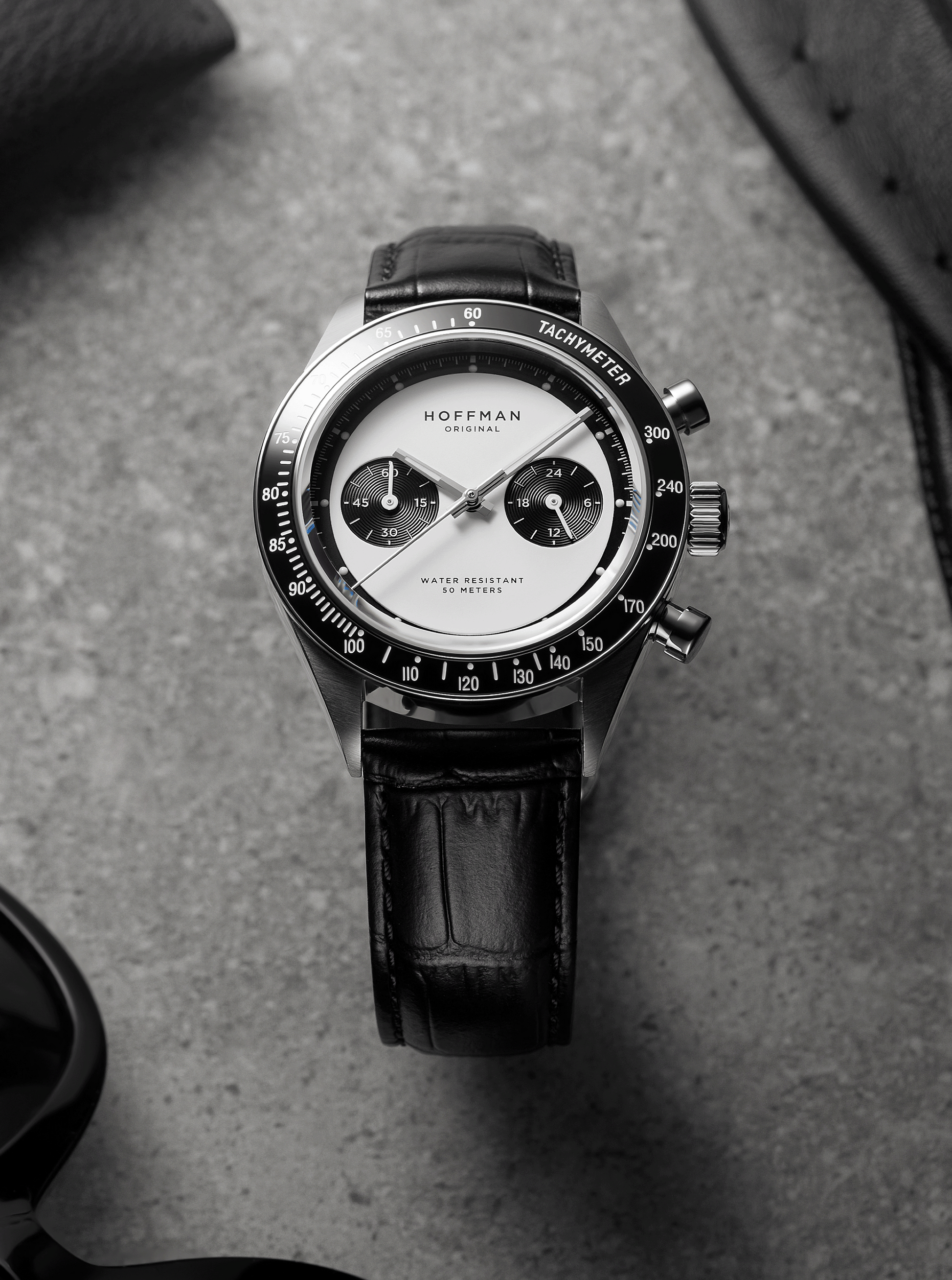 Polished black IPG bezel with engraved tachymetric scale.