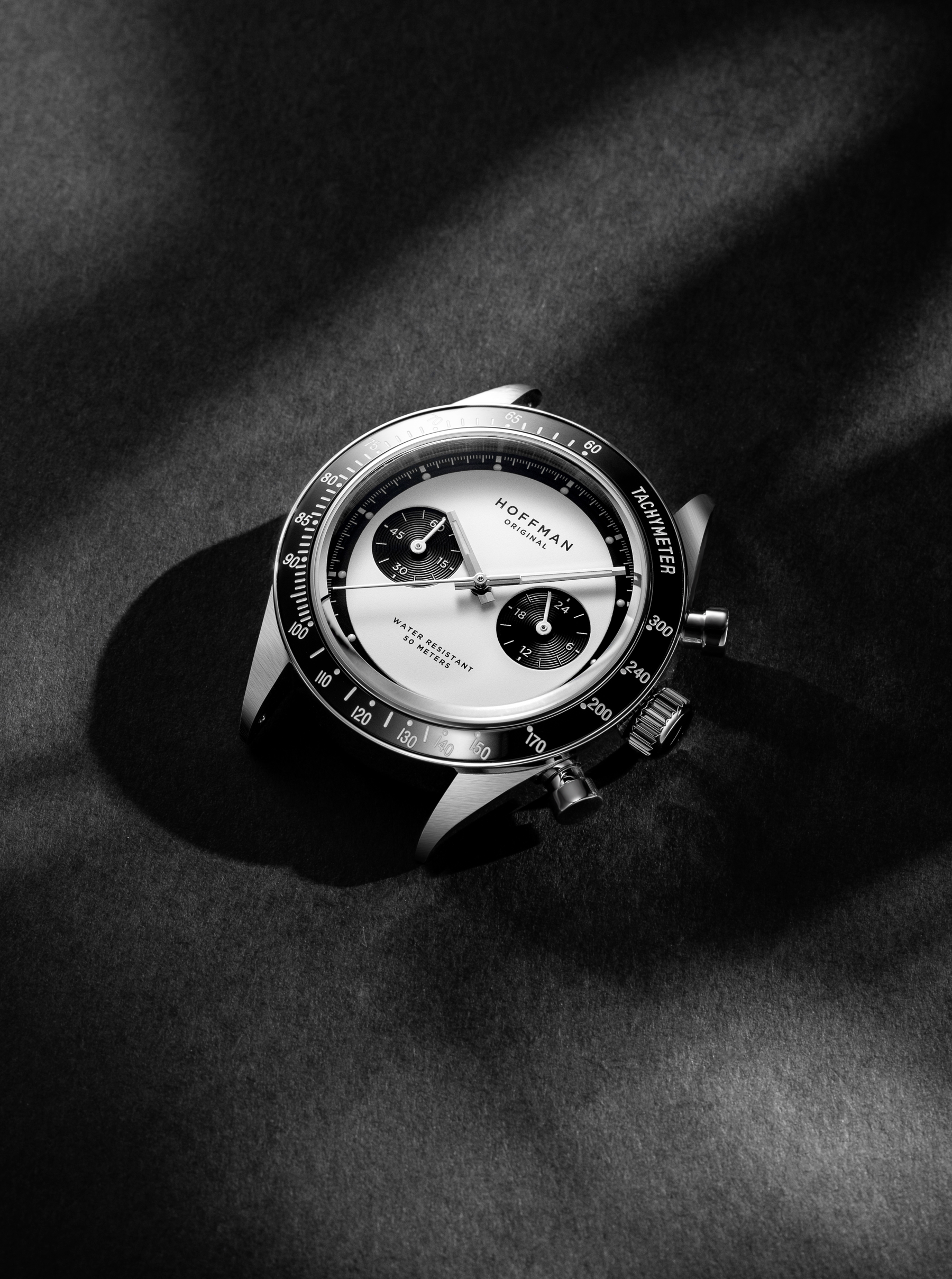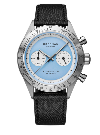 Dual-layered dial with accentuated sub-dials. The 3 o'clock sub-dial displays military time, and the 9 o'clock sub-dial displays chronograph (stopwatch) minutes.