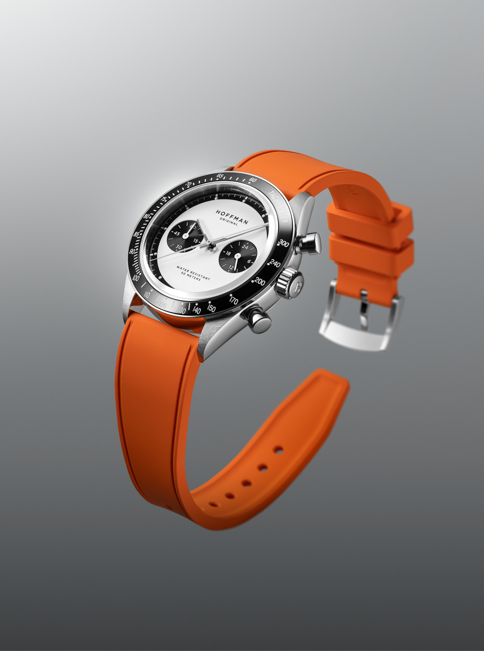 Our new orange FKM rubber strap is designed for comfort and durability. Made from FKM rubber, it offers a smooth, supple feel on the wrist while remaining highly resistant to heat, UV exposure, sweat, and everyday wear. The material is flexible yet firm, ensuring a secure and comfortable fit.