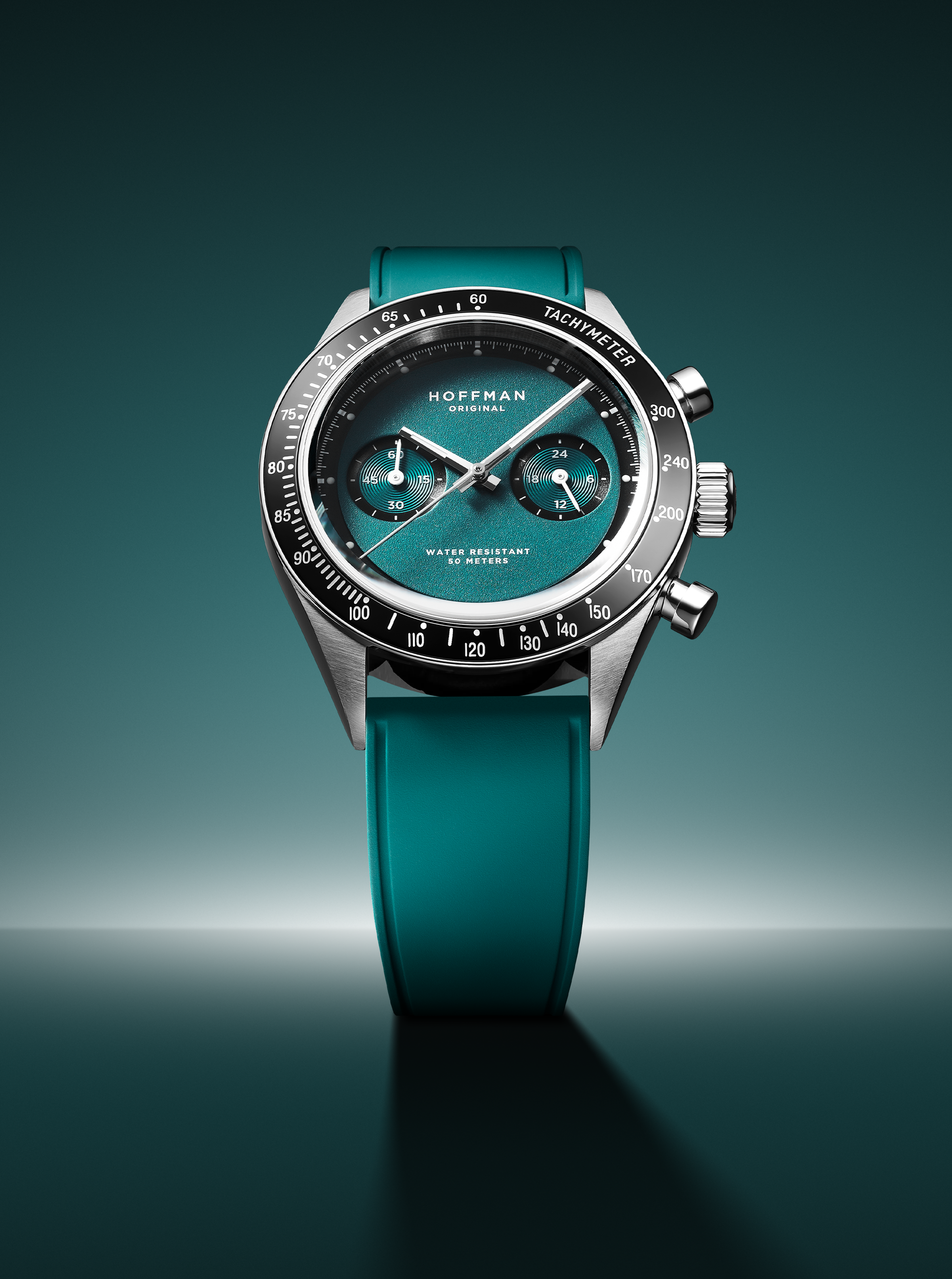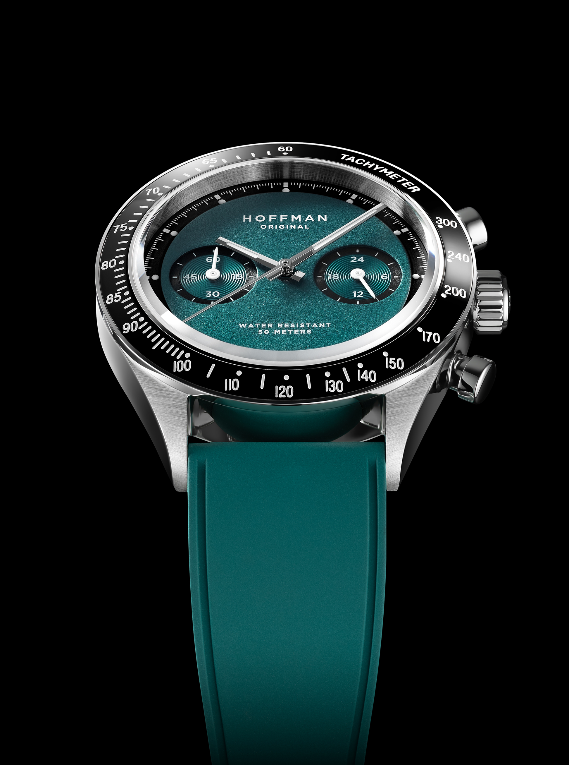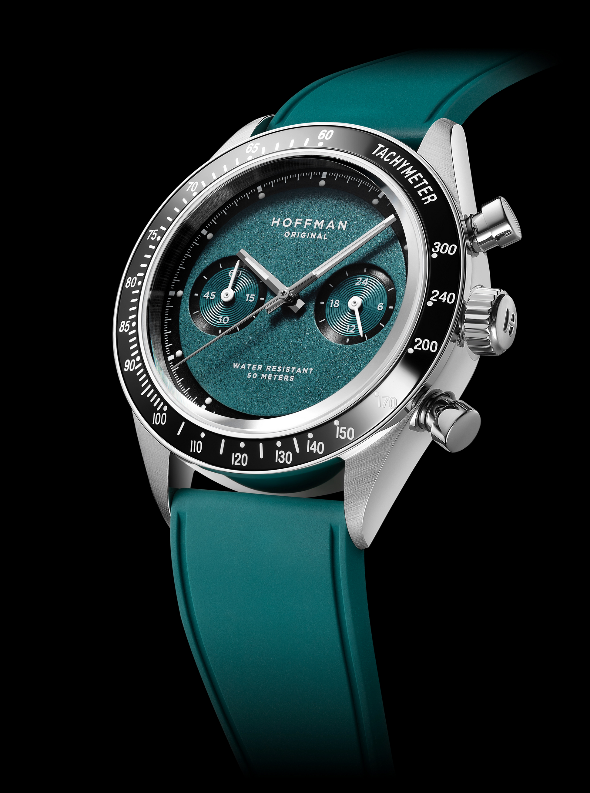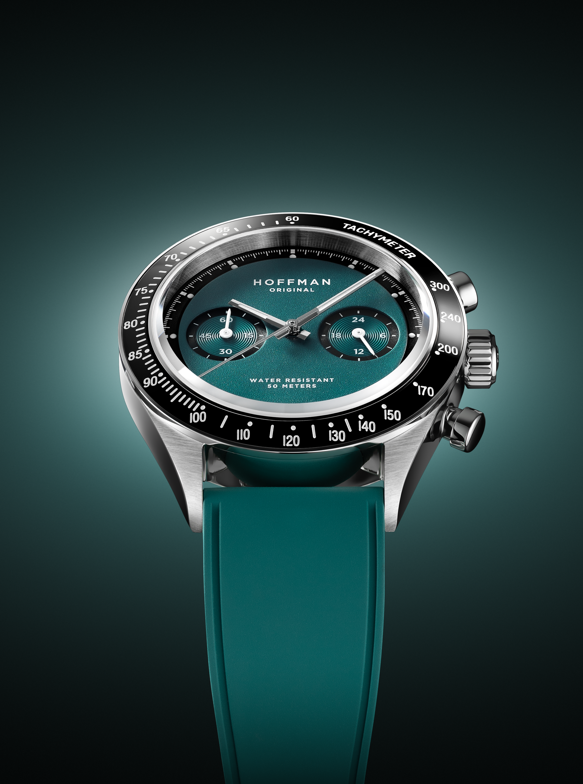 Dual-layered dial with accentuated sub-dials. The 3 o'clock sub-dial displays military time, and the 9 o'clock sub-dial displays chronograph (stopwatch) minutes.
