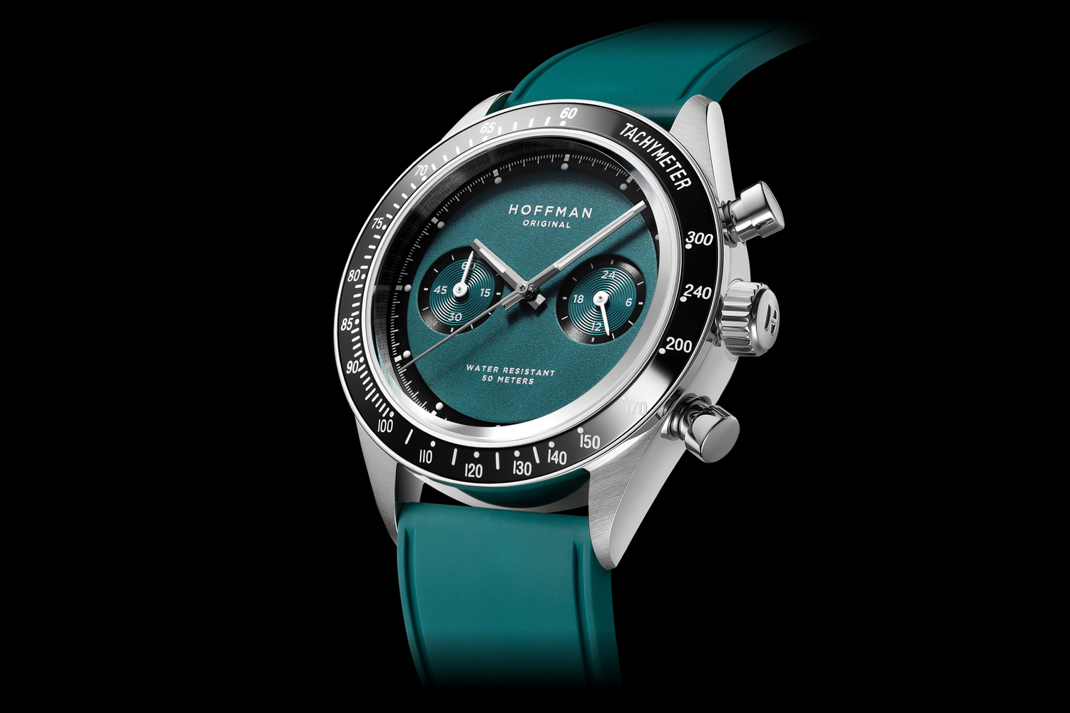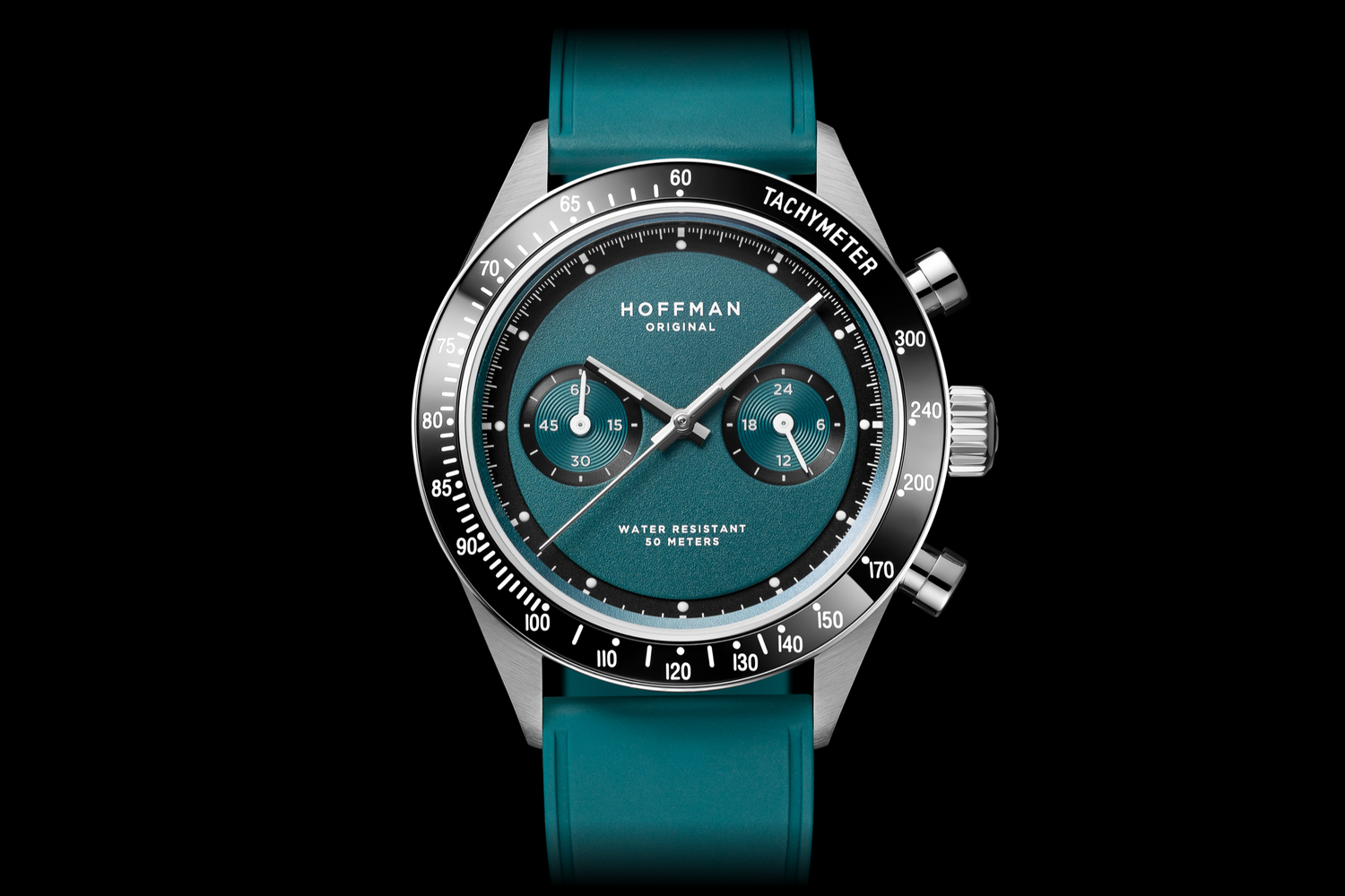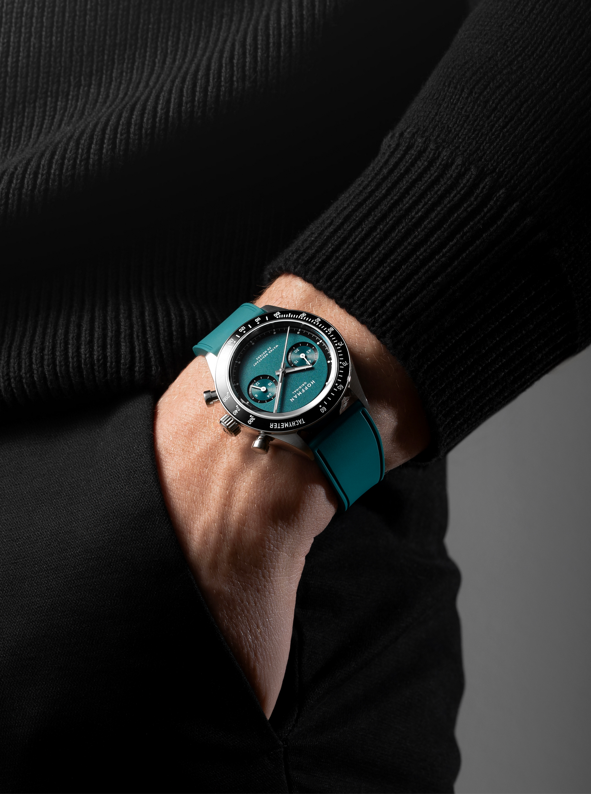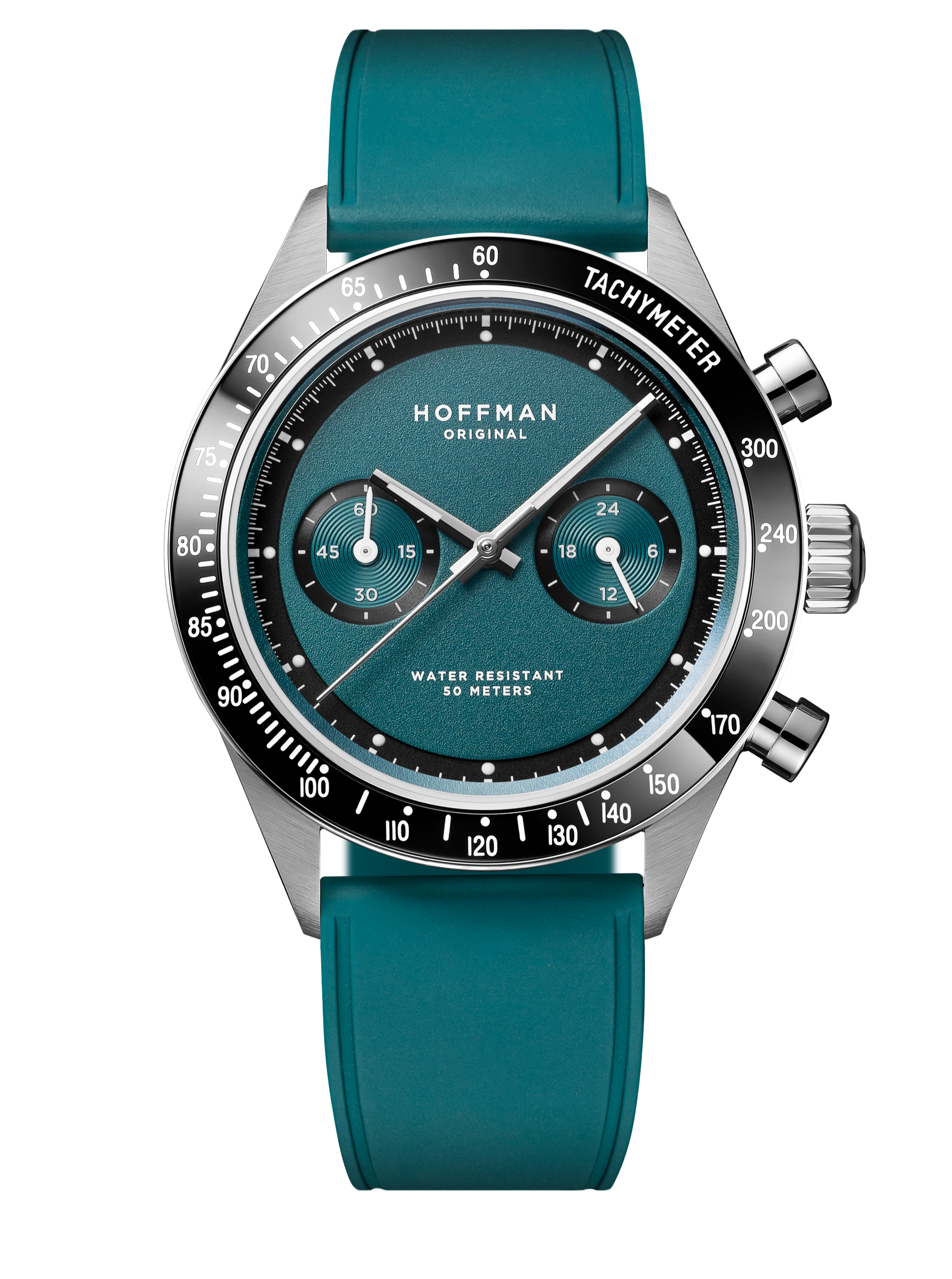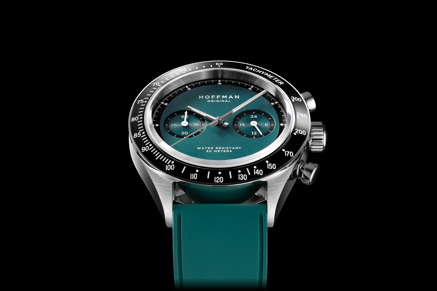 Dual-layered dial with accentuated sub-dials. The 3 o'clock sub-dial displays military time, and the 9 o'clock sub-dial displays chronograph (stopwatch) minutes.