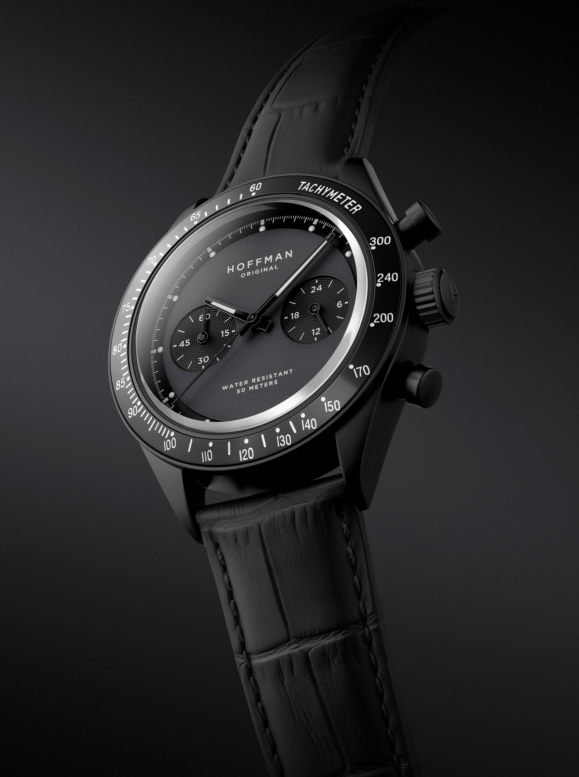 The Midnight is presented in a matt black PVD case, complemented by a polished black bezel with an engraved tachymetric scale. The dial features dual layers in a night-like shade we call Midnight set against black. Embossed circular patterns accentuate the sub-dials and add depth to the design. The sub-dials display stopwatch minutes at 9 o'clock and 24-hour time at 3 o'clock. The watch is fitted with a matt black leather strap with a matching black PVD buckle.