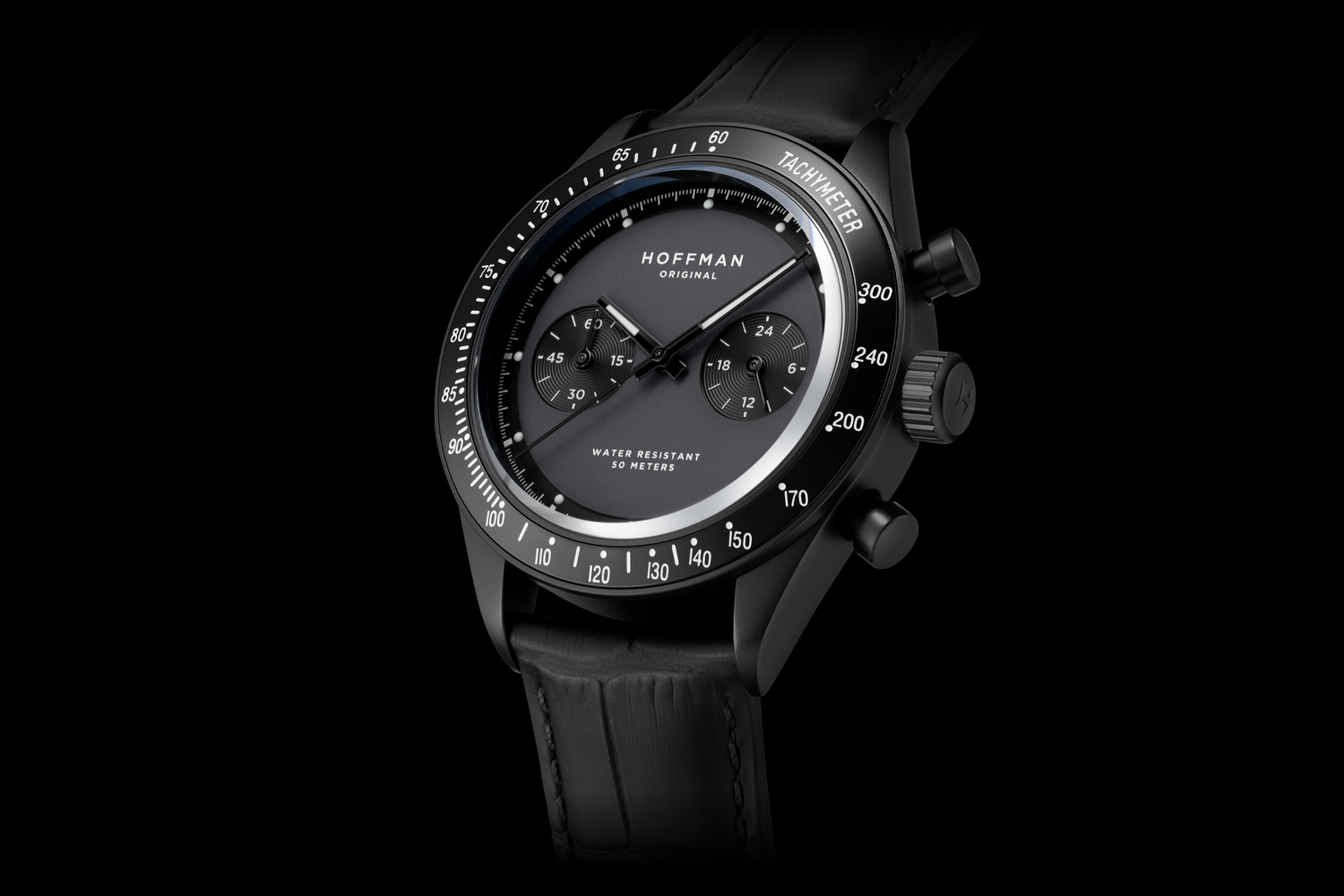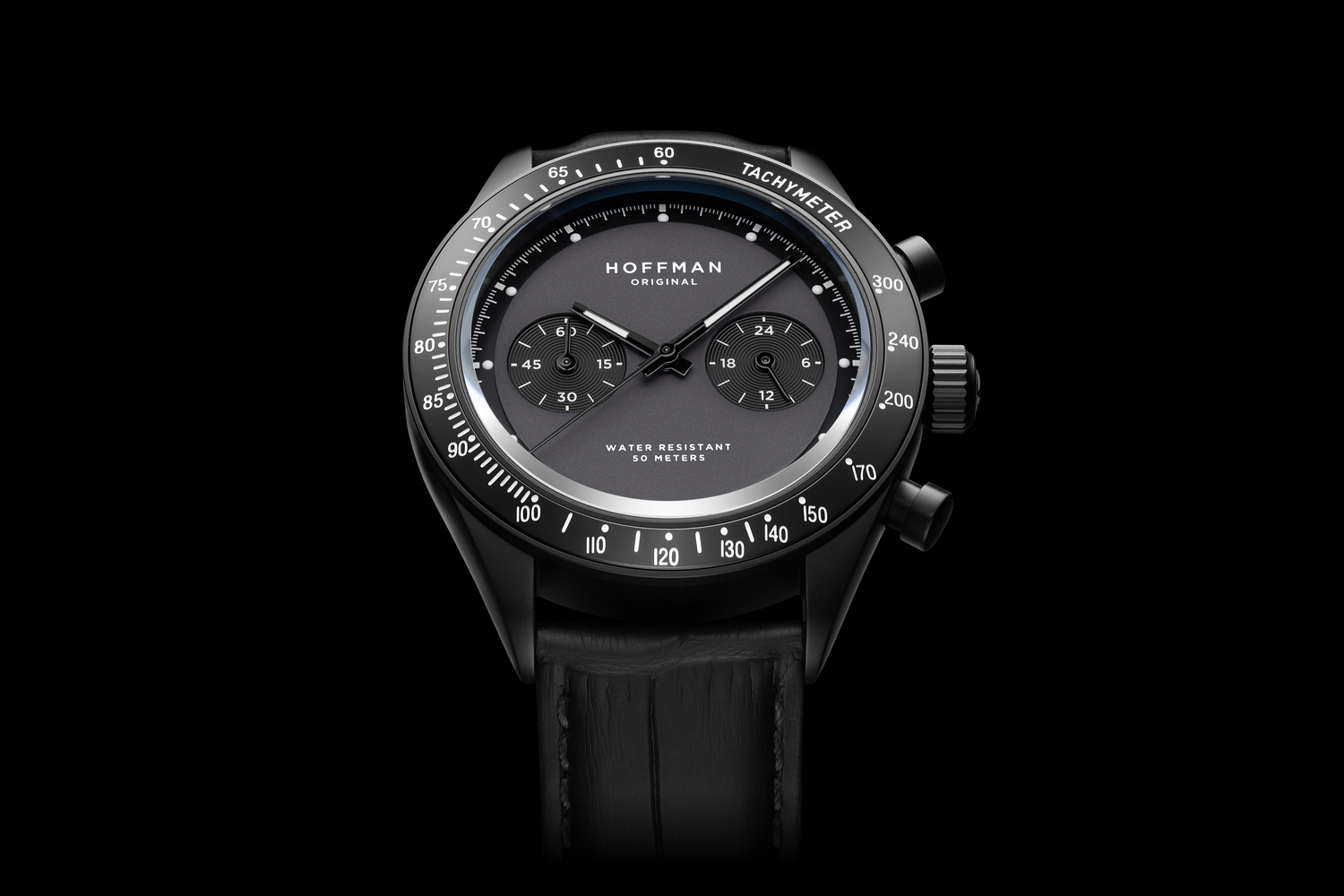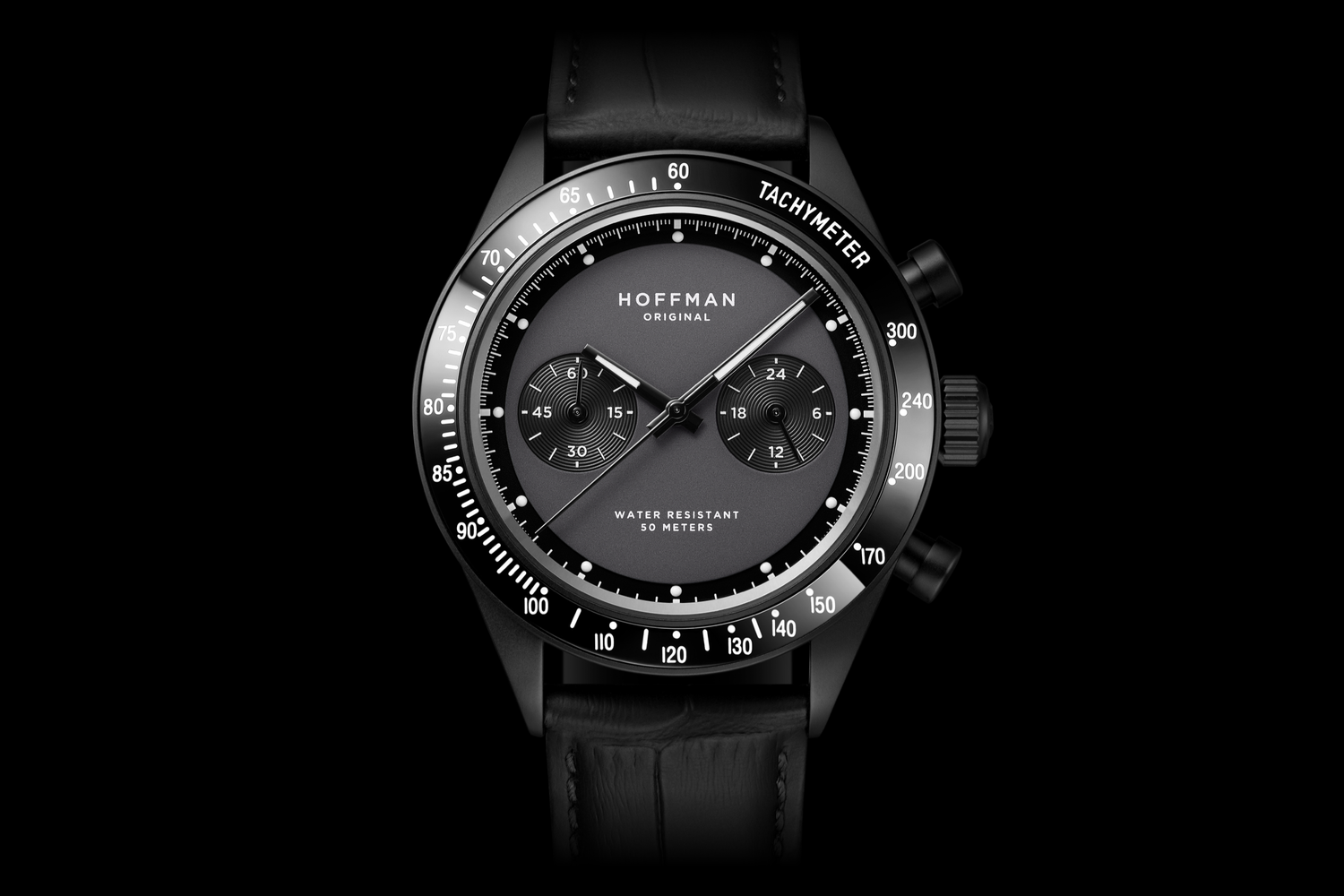 Dual-layered dial with accentuated sub-dials. The 3 o'clock sub-dial displays military time, and the 9 o'clock sub-dial displays chronograph (stopwatch) minutes.