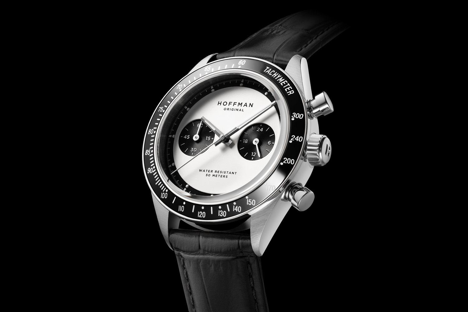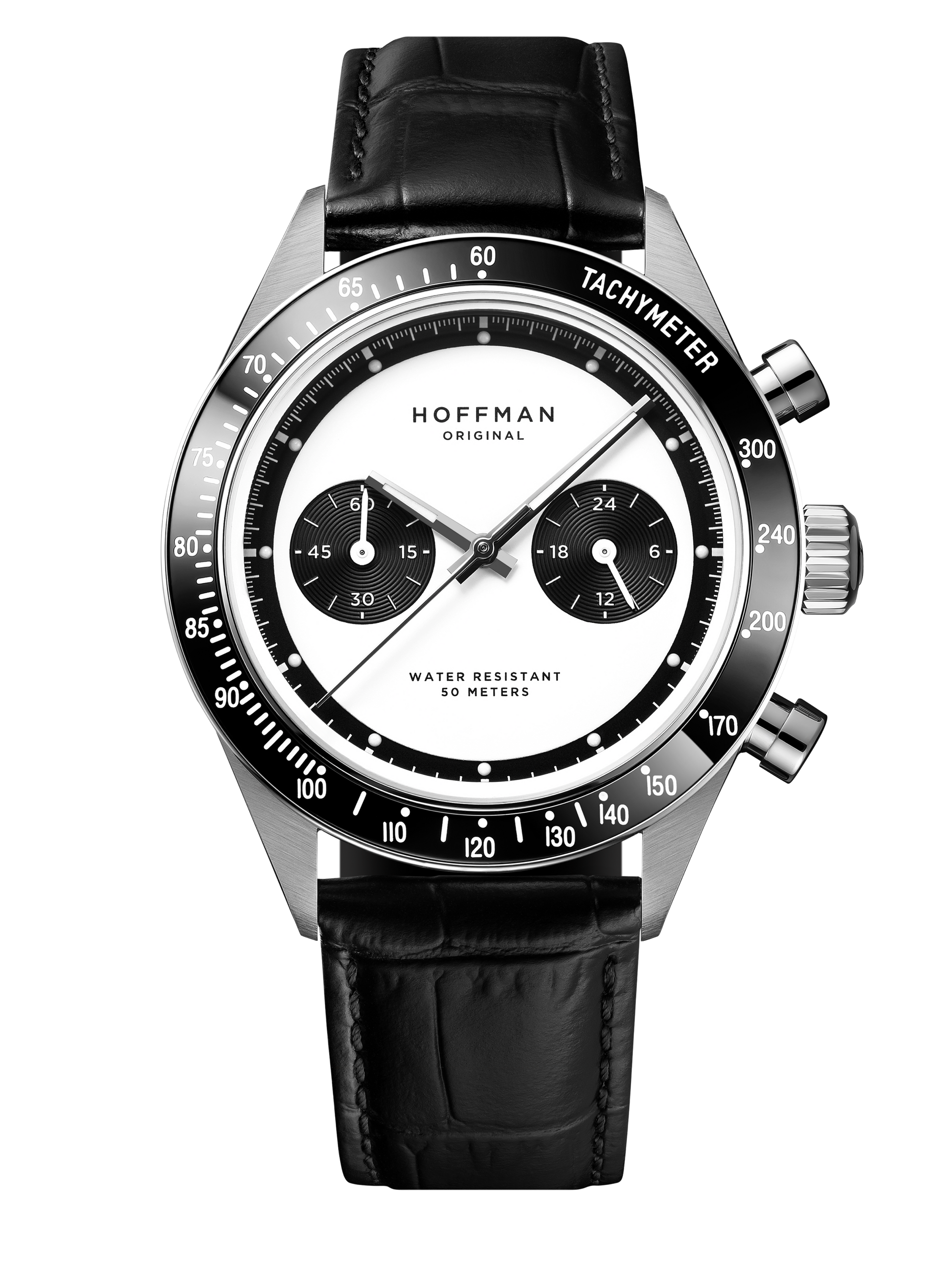 Polished black IPG bezel with engraved tachymetric scale.